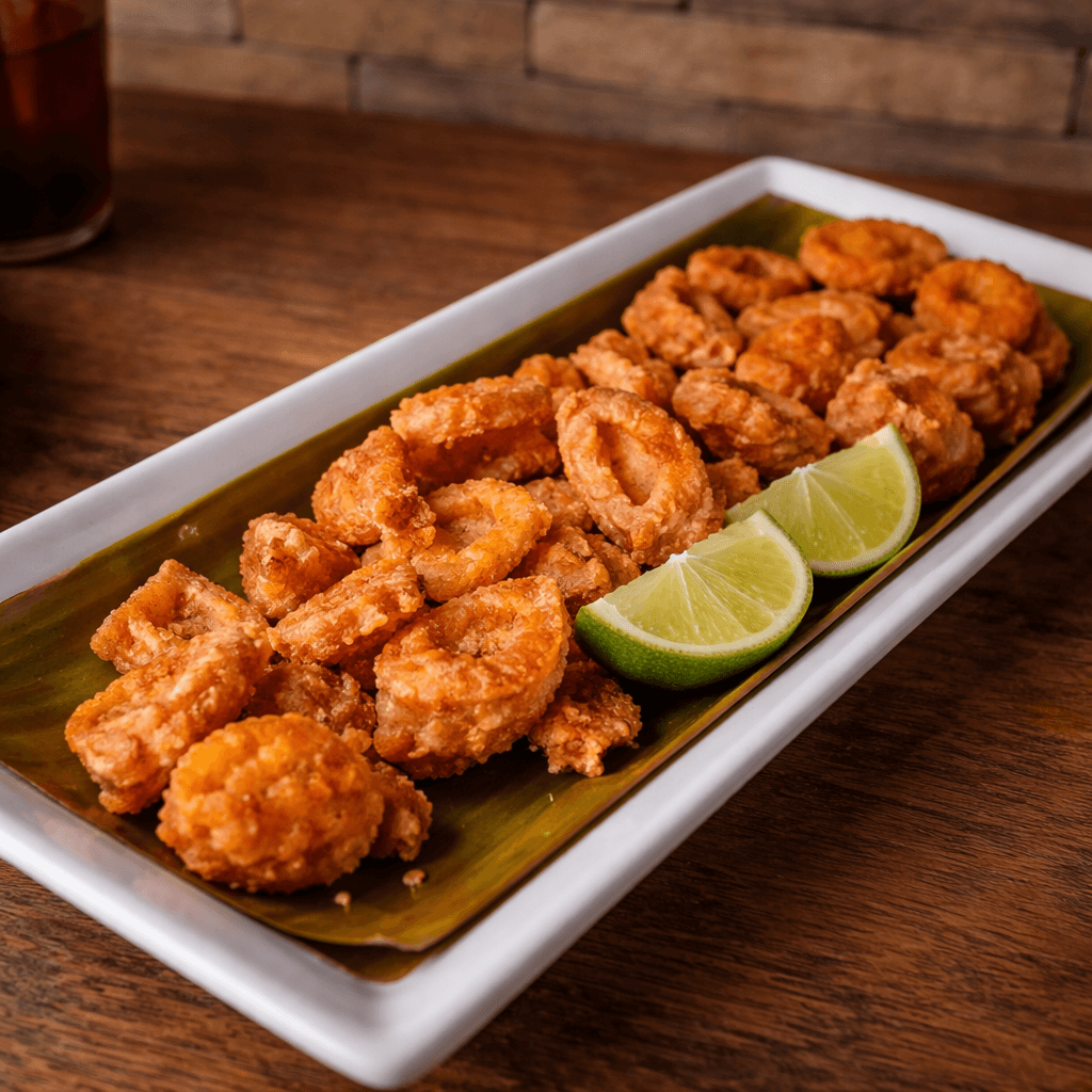 Cerdo frito, crujiente por fuera y jugoso por dentro. Acompañado de 2 bollitos